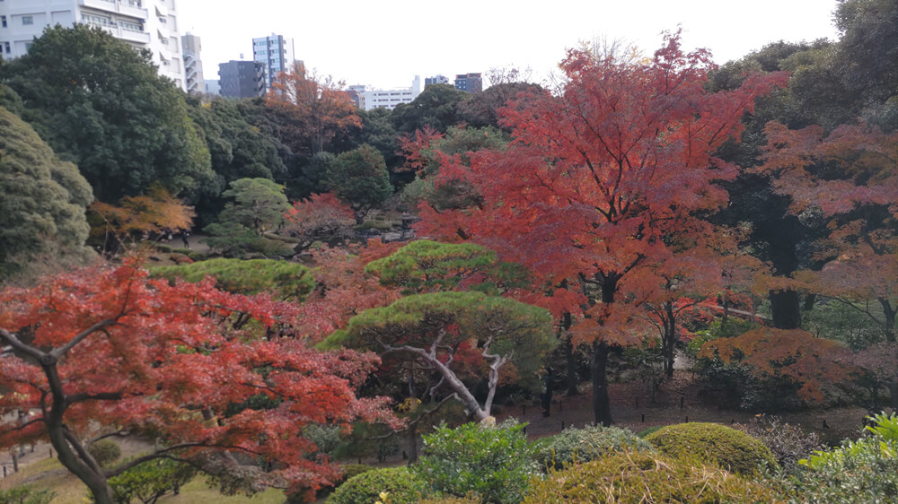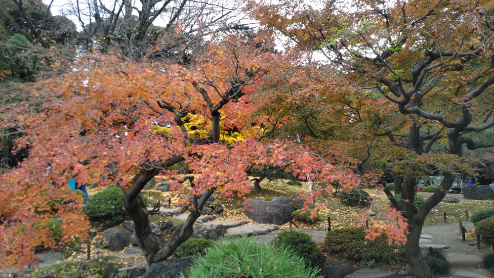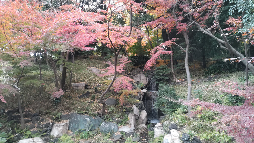和風庭園では、紅葉が進み、色づいた落ち葉が地面に降り積もる。