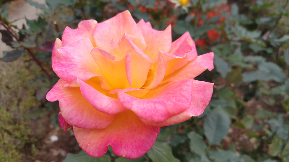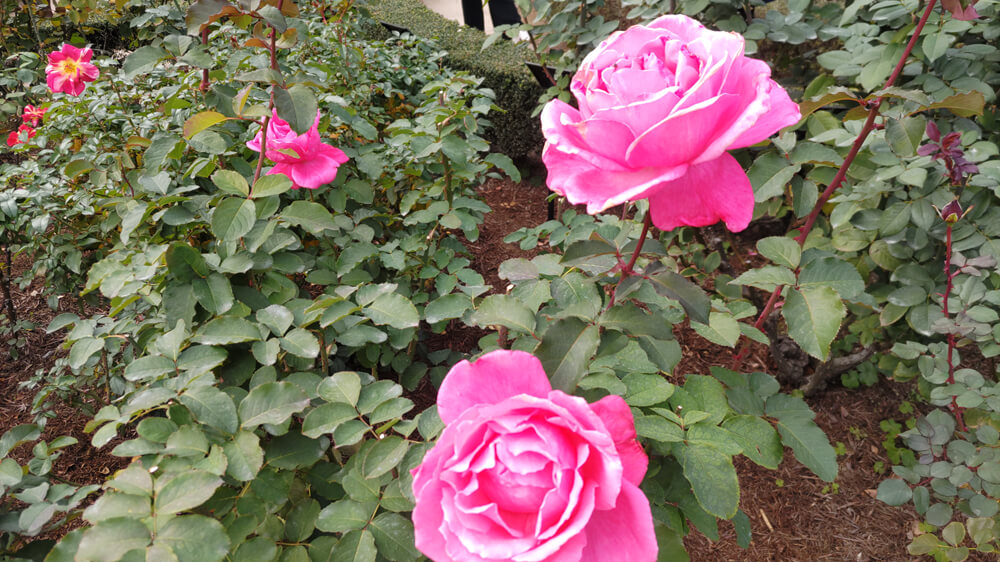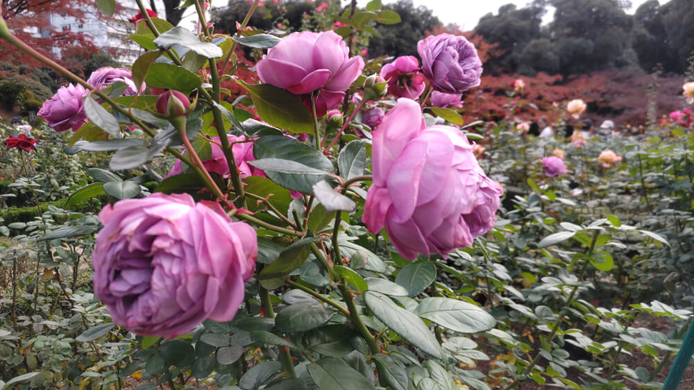 紅葉が深まるこの時期にも、大輪のバラが咲き誇っているのを見ることができる。