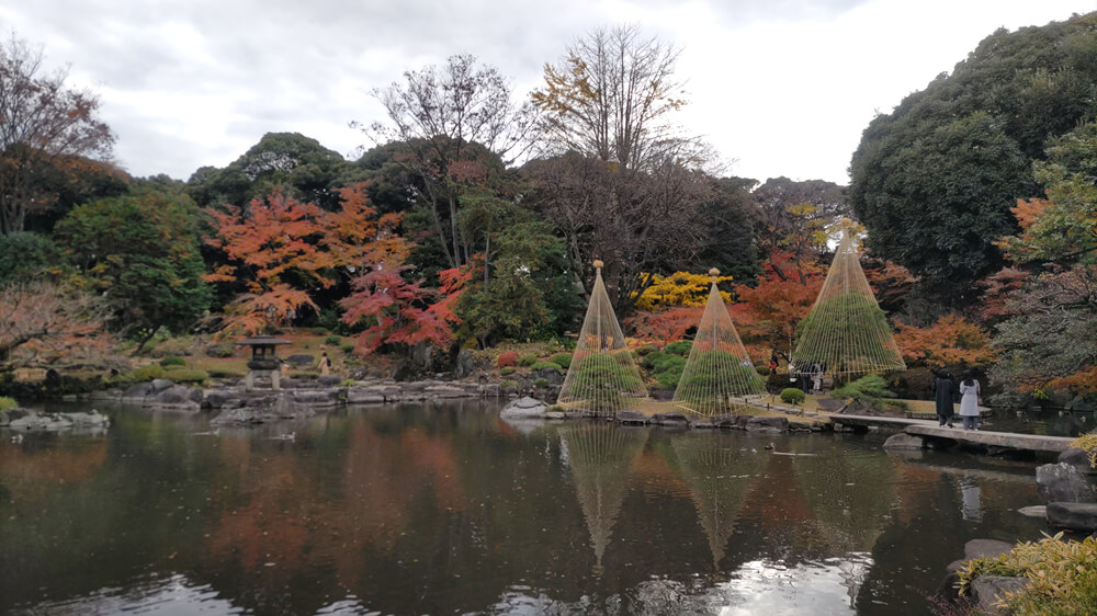 ↓心字池を囲む和風庭園。雪吊りも行われ、冬の準備が進む。