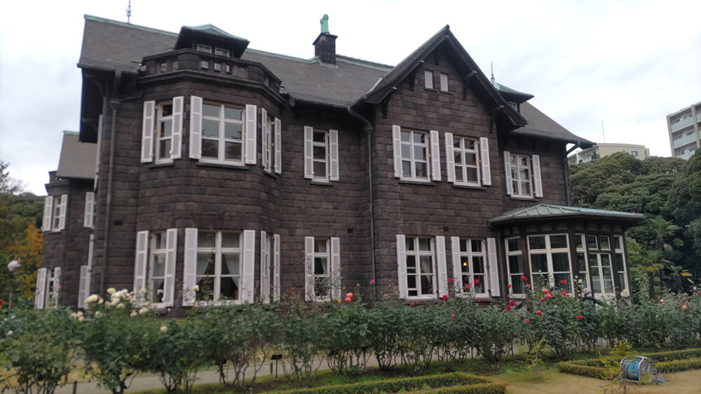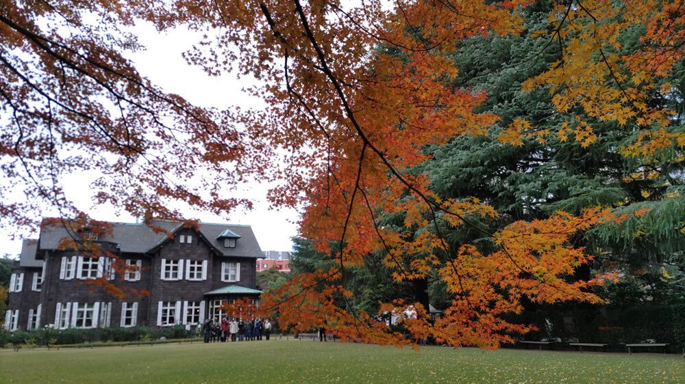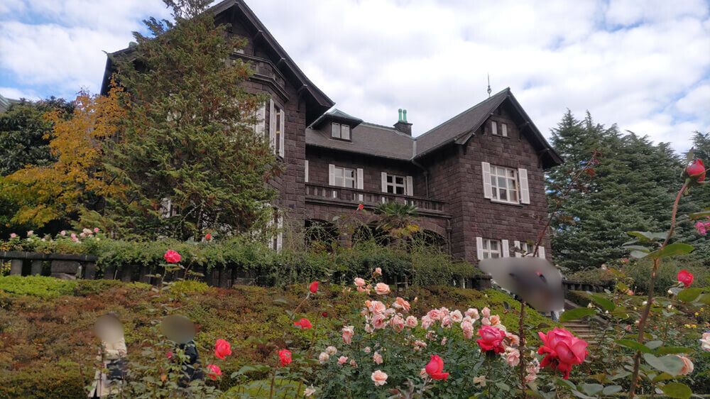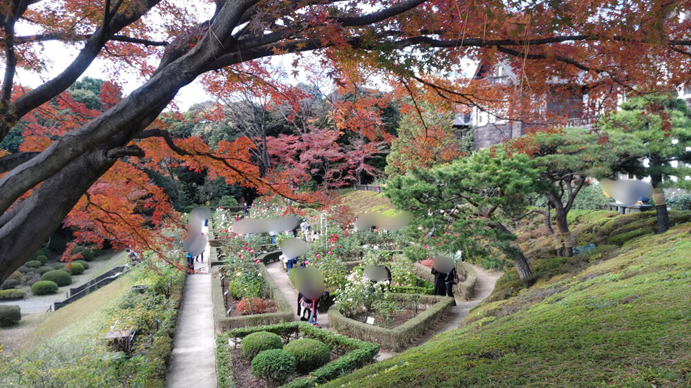 前景に赤く色づいたモミジ、その背景にバラが咲き誇る洋風庭園と瀟洒な洋館が見通せるという景観は、