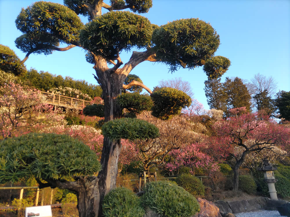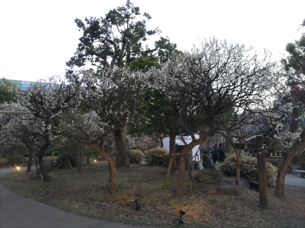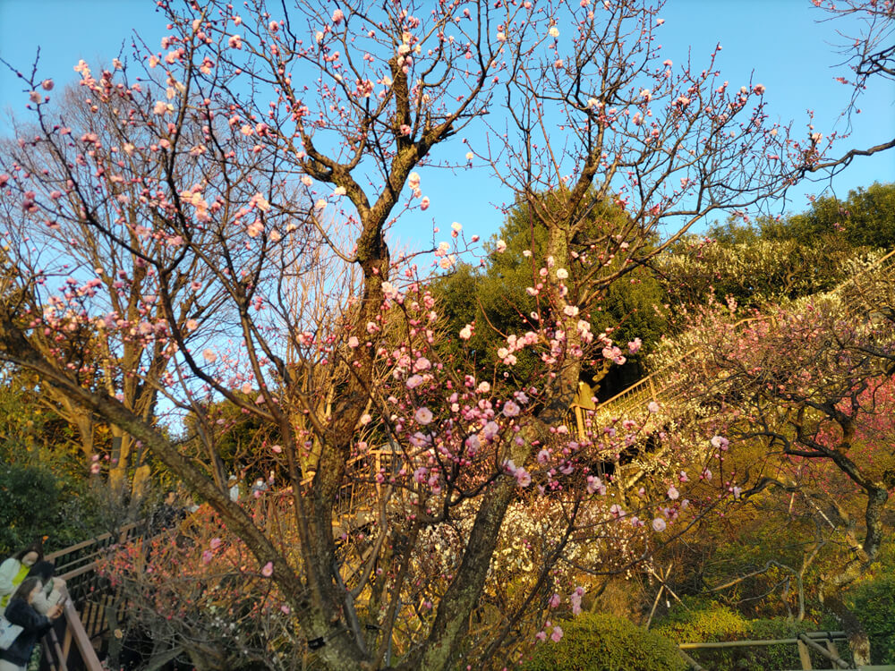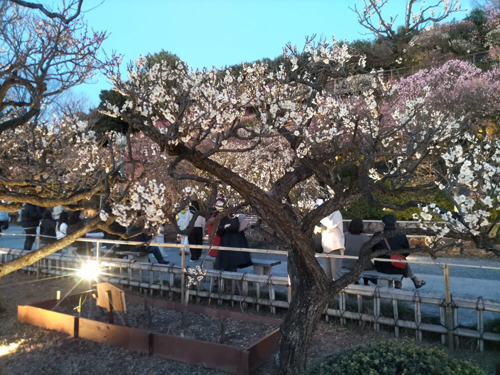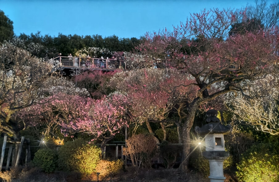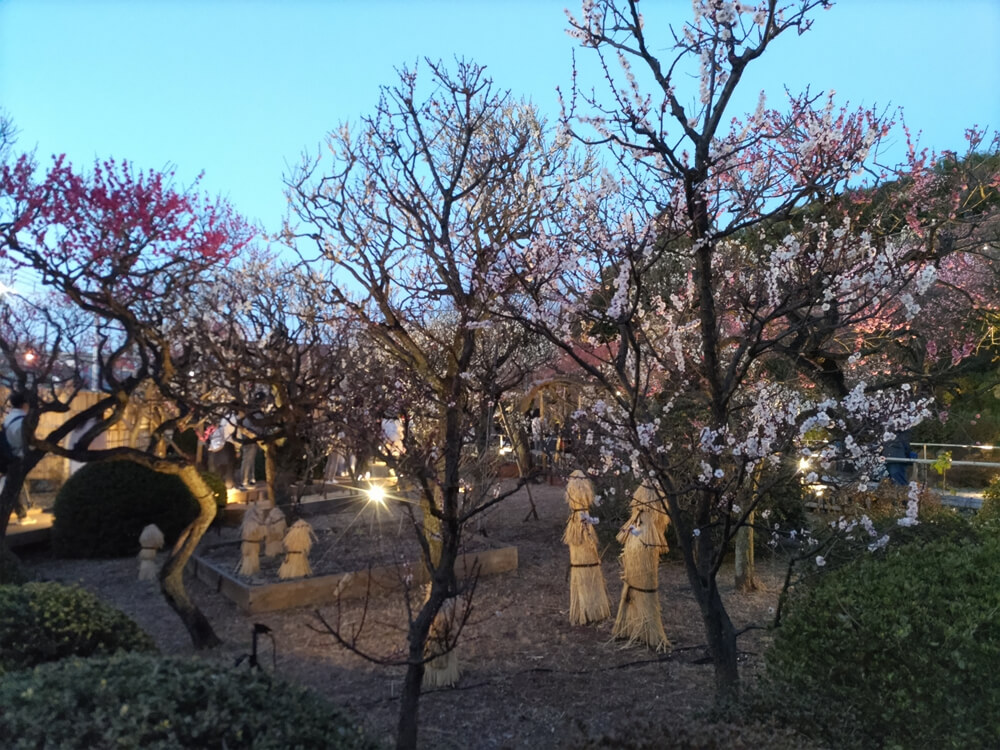 四季折々の花を楽しむことができるが、やはり梅園というだけあって、梅の咲く時期にもっとも賑わうようで、例年、梅が見頃になるタイミングにあわせて、夜間のライトアップも実施されている。