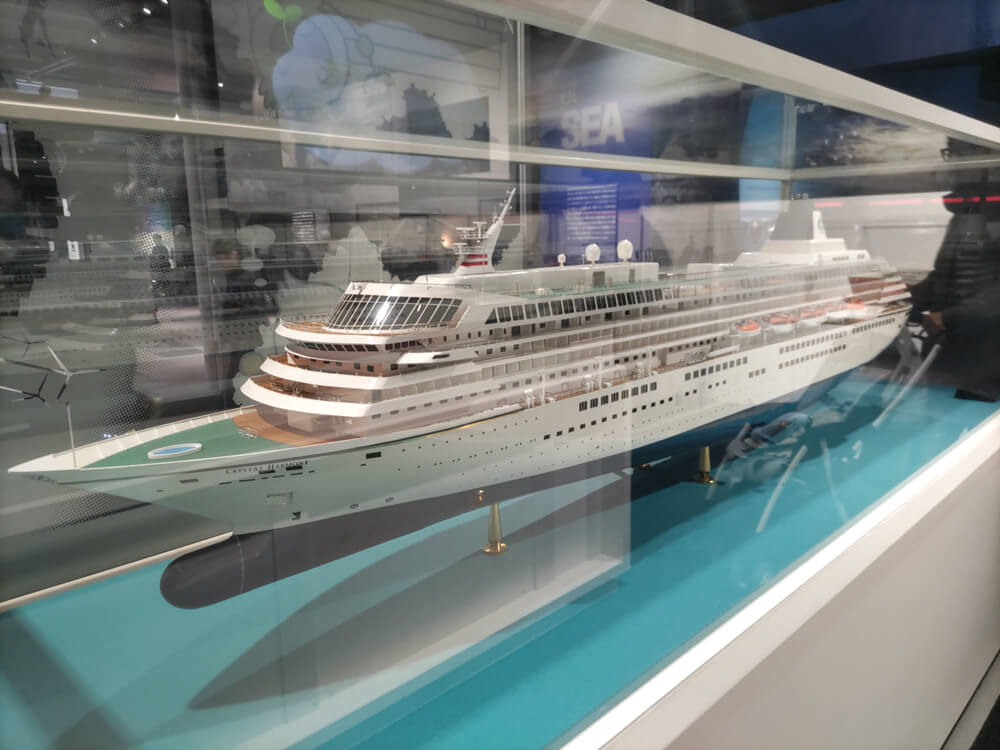 三菱の製品である豪華客船(ダイヤモンドプリンセス、飛鳥Ⅱ)の模型や、海外に輸出されているLRTや無人運転システムの車両の模型などが展示されている。