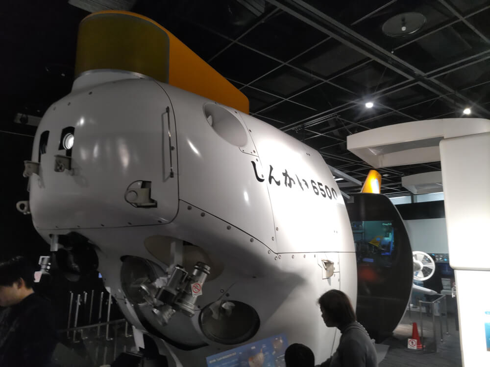 「しんかい6500」の実物大の模型が中心にドーンと展示されており、探査機を輪切りにしたような形で内部の様子も詳しく再現されている。