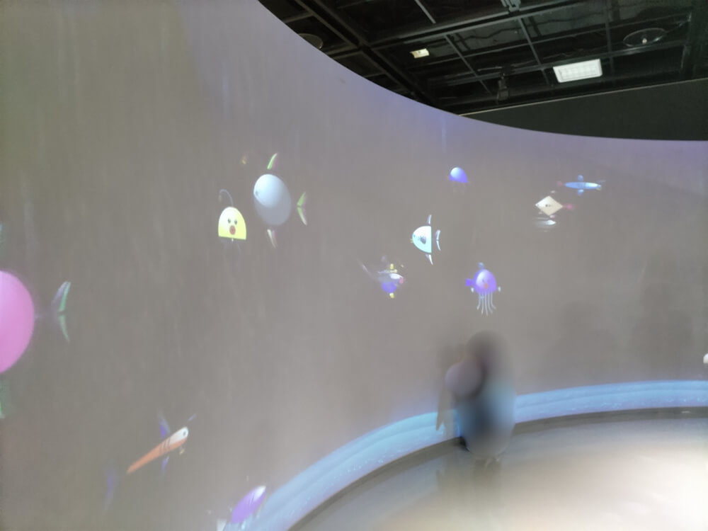 子どもたちが熱心に遊んでいたのは、「シーメカニマル」を作るコーナー。自分でディスプレイを操作して、生き物のような形の海中メカ(シーメカニマル)をデザインし、完成したメカを大きなスクリーンに映し出せるというもの。
