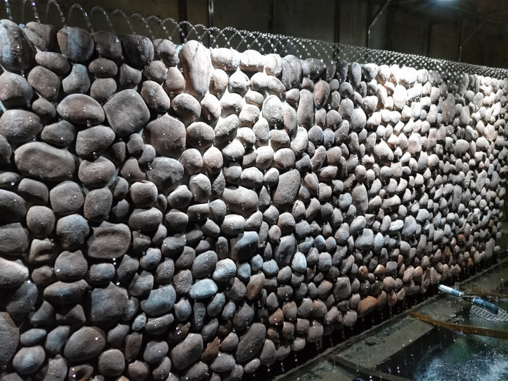 大きな水の玉がいくつも連なり、整列して水流の形になって装置から落ちてくるのだが、水の玉がその場でとどまっていたり、あるいは逆流して下から上に移動していくように見えたりするのである。