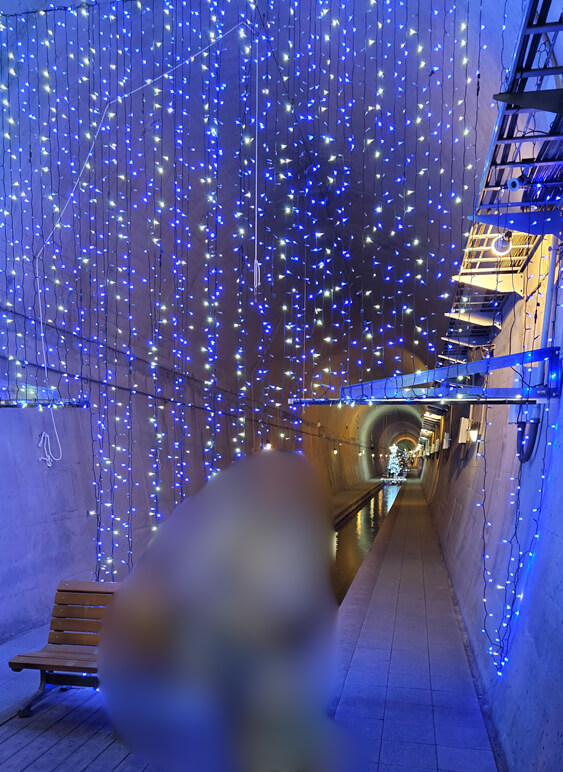 トンネルの中はイルミネーションで彩られており、水路の上には、4月というのになぜかクリスマスツリーが吊るされていた。