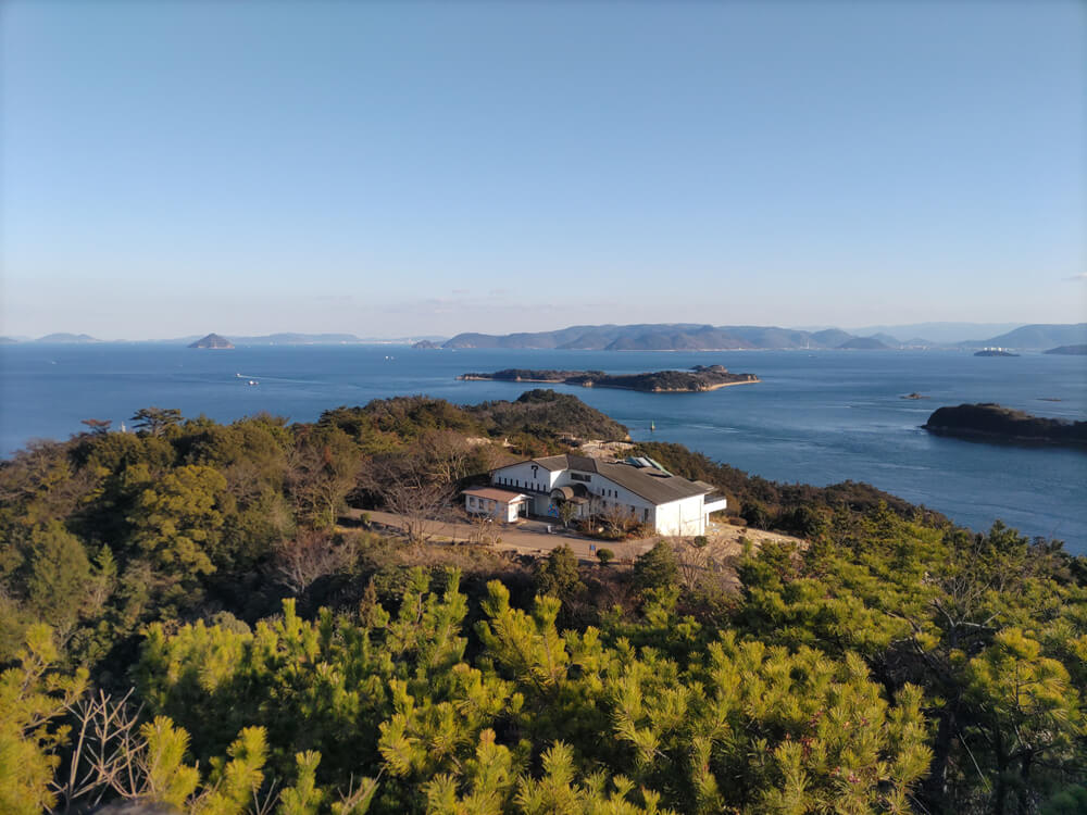 山頂からビジターセンターが見下ろせる。瀬戸大橋の方向だけでなく、周囲の全方位を見渡すことができる