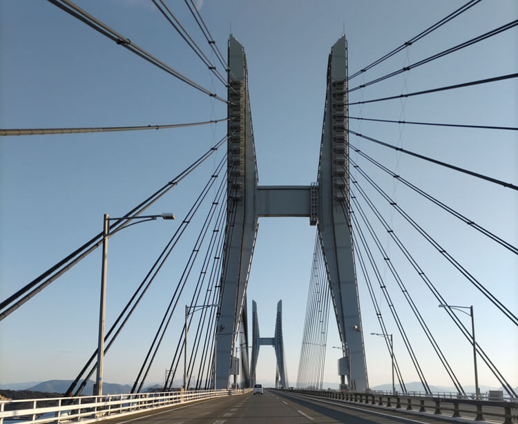 続く「櫃石島橋」「岩黒島橋」は斜張橋という形式であり、斜めにたくさん張られたケーブルが特徴だ。