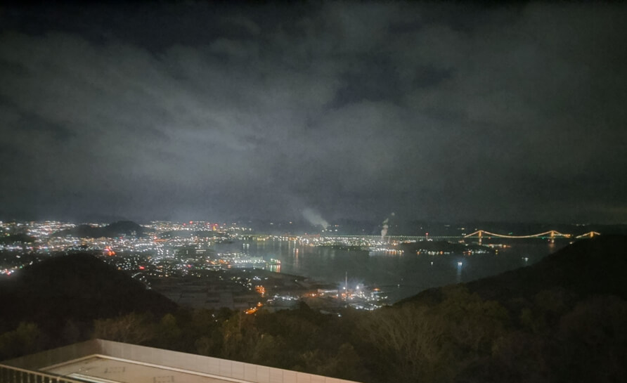 香川県側から見る夜の瀬戸大橋。夜景と橋のライトアップが美しい