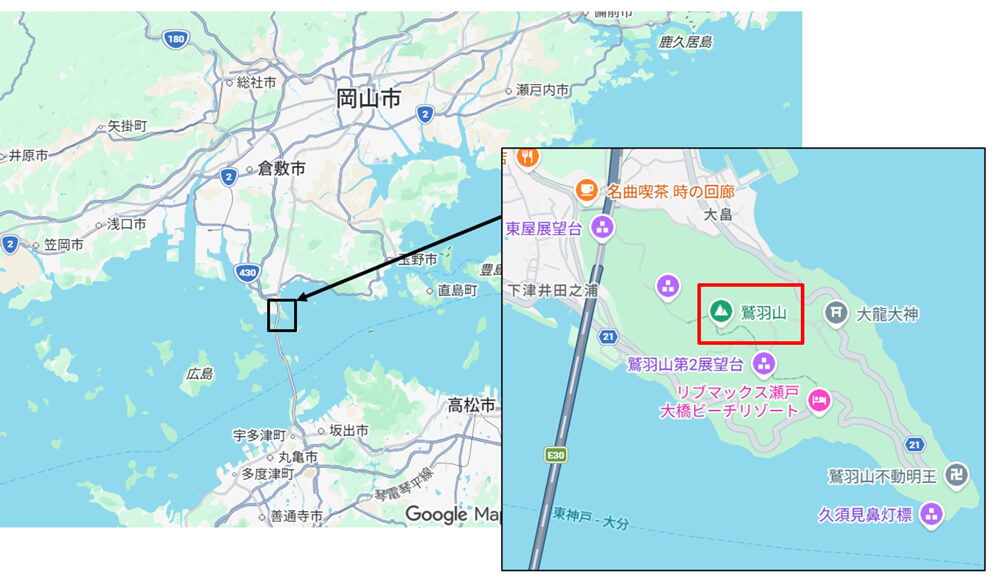 鷲羽山は岡山県・倉敷市にあり、イメージとしては瀬戸大橋の岡山側のつけ根のあたりに位置する。